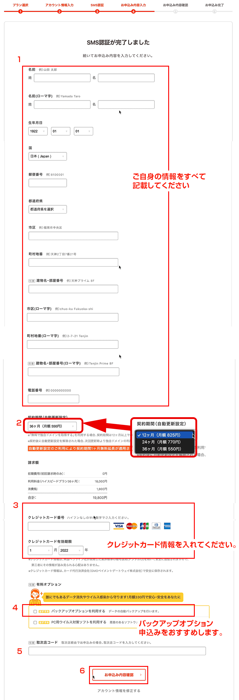 2:契約期間をお選びください。36ヶ月だと月額550円になり、お得です。