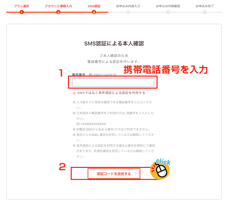 ご自身の携帯電話の番号を記載して、「認証コードを送信する」ボタンをクリック