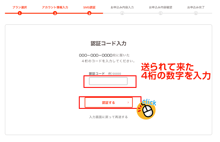 4:送られて来た4桁の数字を記入してクリック